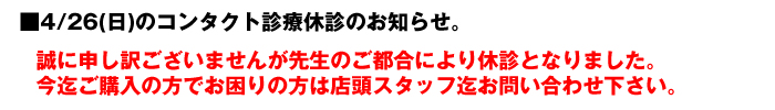 ※4/26(日)コンタクト休診となりました。 ■5月の予定 5月の日曜日は、5/3以外はコンタクト診療有り。 GW休業のお知らせ。 4/29(水)、コンタクト休診・メガネのみ営業です。 5/3(日)〜6(水)は、店休日となります。